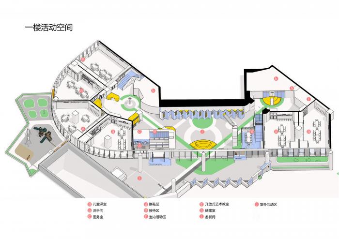 将光线最好的地方留给儿童即教室空间,通过公共区域去连接不同的课室空间。在课室外设置感统游戏,小剧场功能,让孩子在园所内有更多的空间与园内其他小朋友或老师进行不同的教学活动。