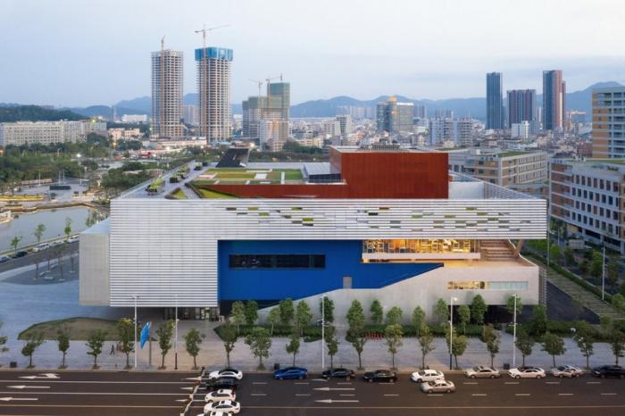 这栋建筑也是一个疏松多孔的盒子,深入在建筑不同高度上的户外花园与平台,引入丰富的植物,创造宜人的室内外环境。绿化屋顶大量减少了热负荷;建筑表皮是为深圳气候条件而设计的一种双层复合生态表皮,外层的V形剖面单元的穿孔铝板,有效地遮掉夏日的阳光,并保持着足够的视觉通透性与自然通风。结合一系列节能环保措施,我们也希望突破剧院建筑作为高能耗建筑类型的固有思维。