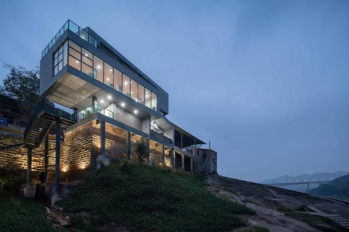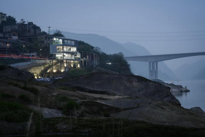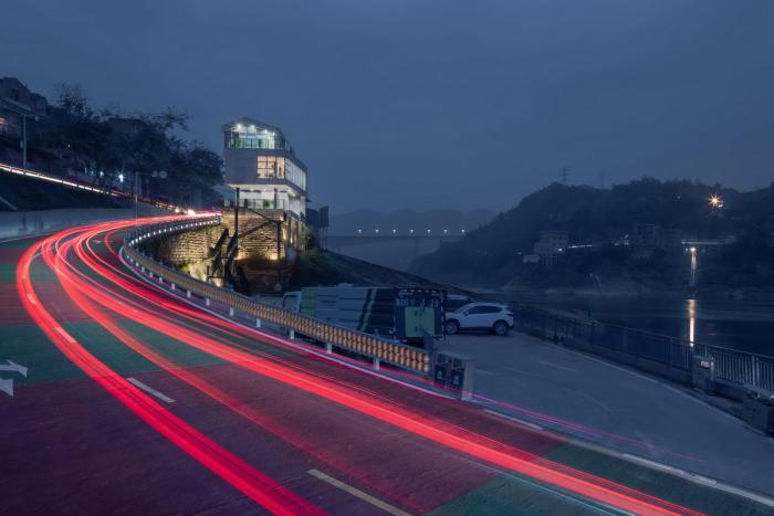 △ 夜色下的车渡服务站 ©刘国畅 项目位于嘉陵江西岸的一处由条石垒砌的崖壁之上,地块紧邻经由三胜码头驶上车渡船的施家三胜公路。场地面积只有150平方米左右,为满足多种空间复合的多样性需求,我们将建筑依场地形状南北向为长边摆放,东面临江,西面靠山,最终用三个基本长方体块以上下错落叠加的组合方式而矗立于场地中。