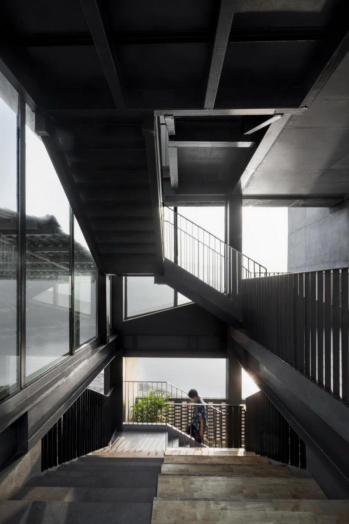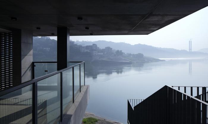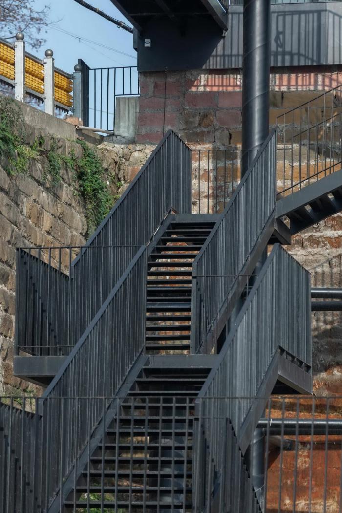 △ 隔江远眺 ©刘国畅 创造契机,挑战制约 为解决条石垒成的将近11米的崖壁高差,我们用一座宛如山城步道的折行钢结构楼梯来连接建筑底层和位于江边的室外停车场。作为整个建筑的前景,打破了建筑本身体量的秩序,在拾阶而上的行进中以达到不同的空间体验。