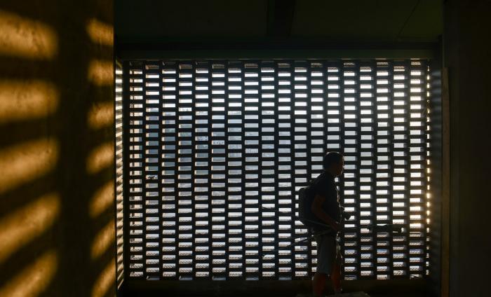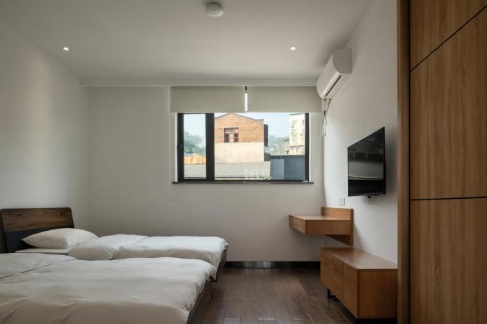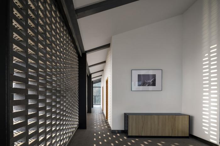 △ 融于市井 ©田琦 建筑主体结构选用全钢框架结构,外围护结构则以水泥纤维板为主,部分墙体采用青砖砌成的传统砖花墙。采用部分砖花墙而不是大面积的落地玻璃窗的处理既保证了建筑体量的完整性,镂空的部分又保证了建筑内部的采光,并且能形成独特的光影效果。