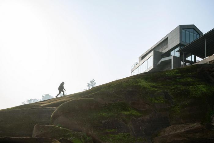 △ 河岸边的心形巨石 ©刘国畅 南北向大小不同、交错布置的三个体块化解了场地的局促紧张,出挑的体量形成了多个灰空间,丰富了空间层次及立面构成。