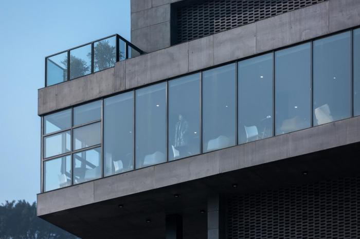 △ 清晨的光与影(施工中) ©田琦 建筑灰色的整体进一步使得建筑相对于周边建筑高大的尺度有所消解,也与三胜村整体的色调相符,让建筑如本身生长在江边的巨石一般,低调地伫立在嘉陵江畔,体现了独特的场所精神。