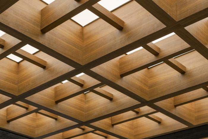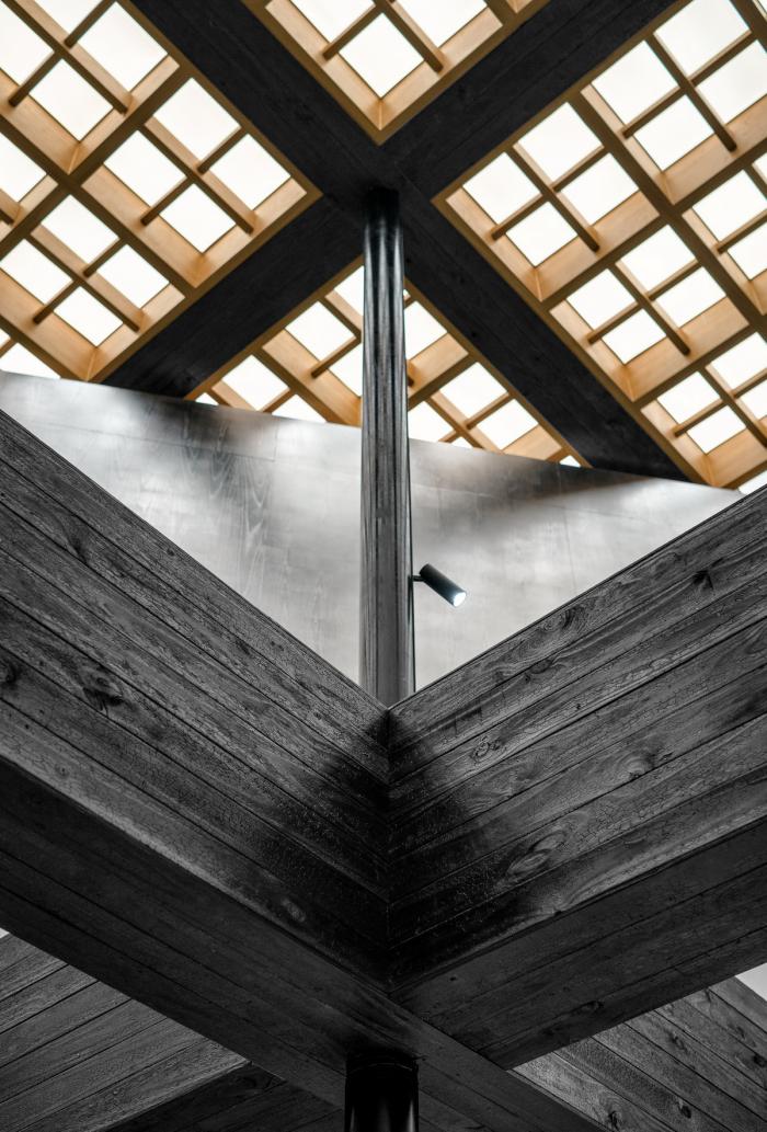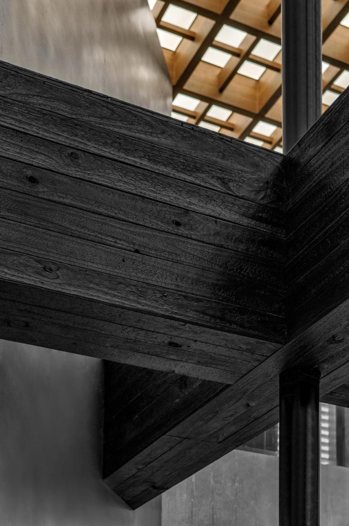 中庭正中间保留了原始的结构梁,予以炭化木自身独有的自然粗旷与天花的理性排列的木纹格子结合,以一种中式且现代的空间力量及仪式感形成空间结构特色。