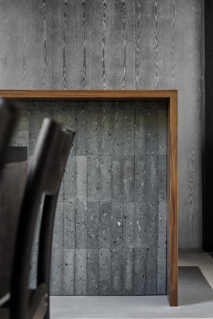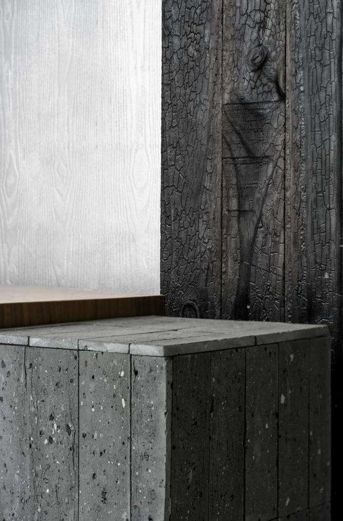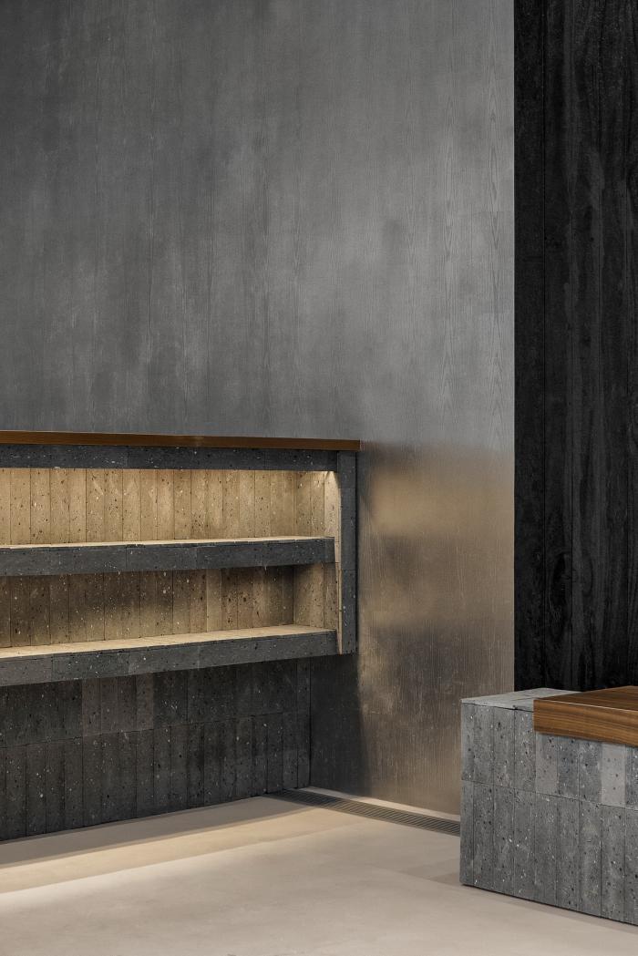 银箔这种传统材料并未直接的大面积使用在空间内,而是与木饰面作贴合成为带有木纹肌理进化版“银箔”,中和了炭黑色木及天花矩形阵列设计语言下的肃穆、及理智。使整个空间质感更加的柔和且温暖。