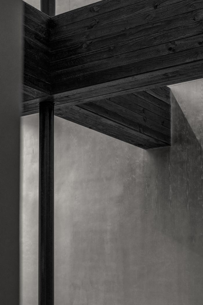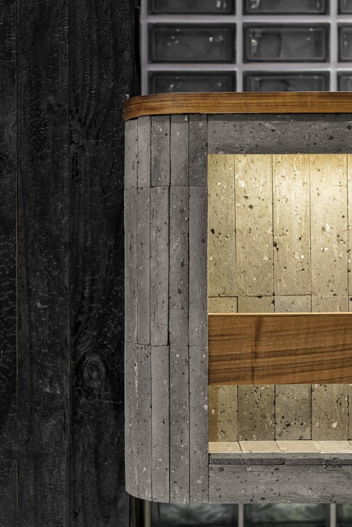 空间内主要使用了灰砖及木头-两种中式建筑的标志性材料。以不同的组合、及质感碰撞展示自身在传统及现代中的变换。青砖、柚木、炭化木,这些材料的自然纹理隐现时间的印记,与场地散布着的古城墙无声对话。