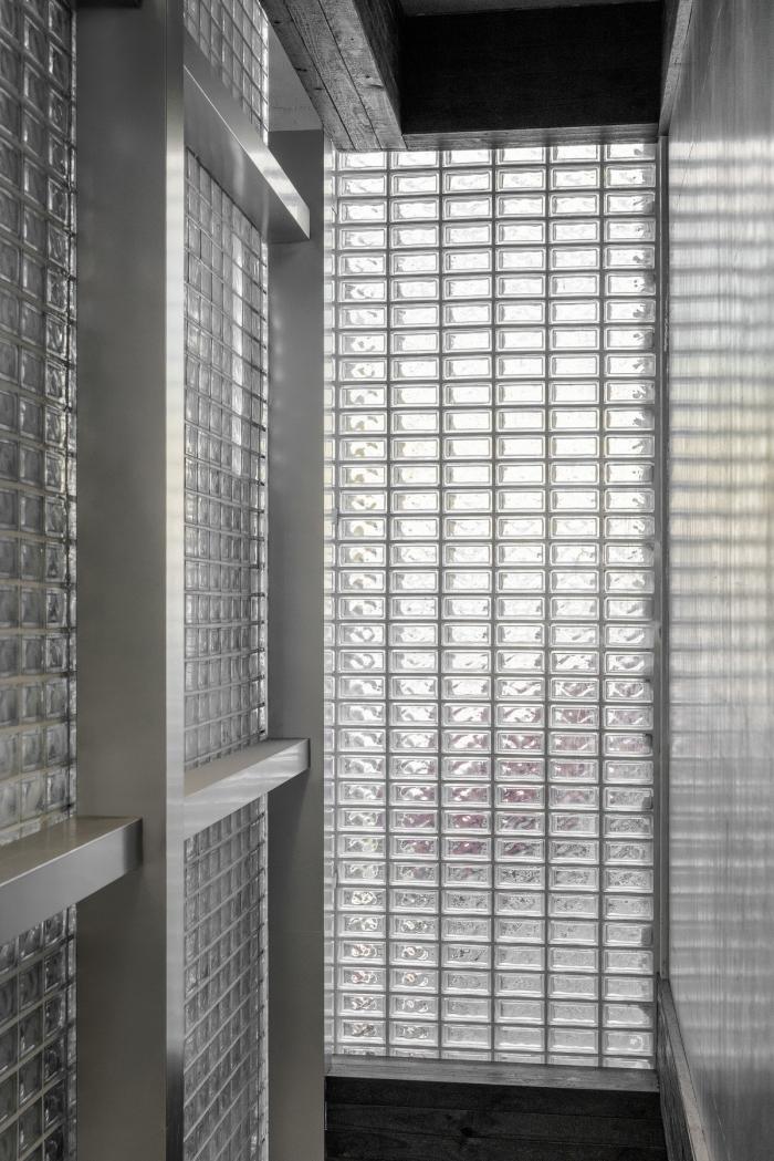 透亮干净的玻璃砖的立面材料隐约的透射着外面的色彩,理性的十字结构框架语言使空间语言趋向统一。