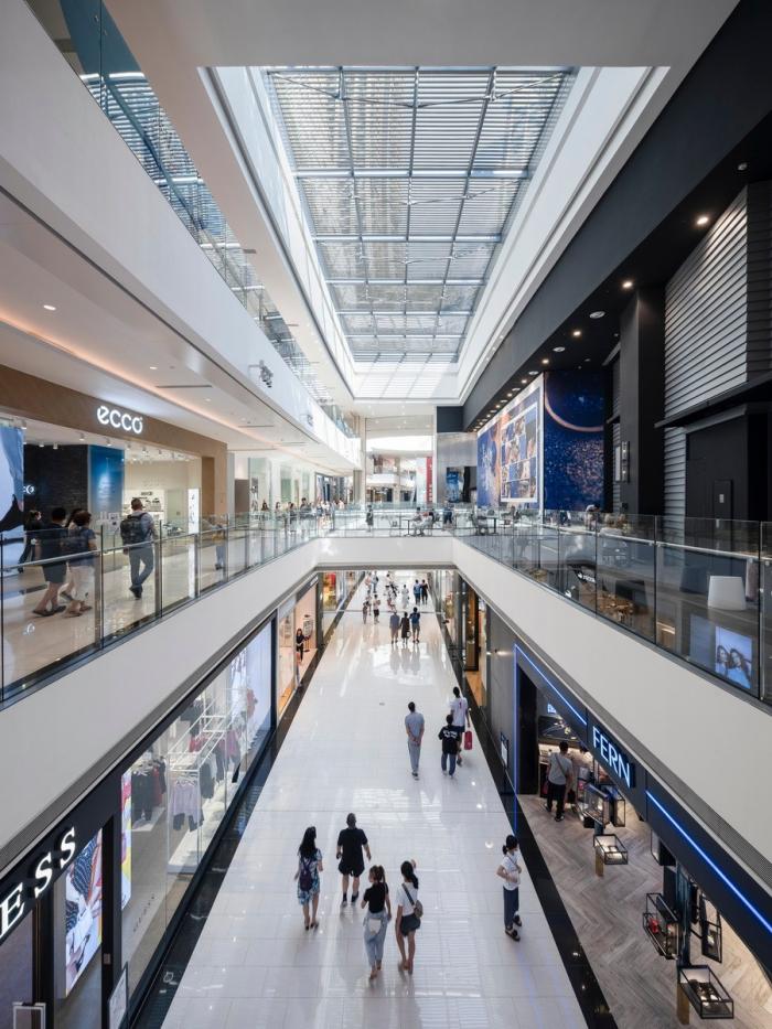 为了给到访者足够的方位感和乐趣,重庆来福士五层购物中心提供了三大主题空间走廊,分别汲取江水的颜色做为其辨别标识(其中靠近西侧嘉陵江为浅色调,靠东面长江一侧为暖色调,中间一条走廊为白色),同时与城市南北向主干道保持平行,成为城市街道在购物中心内部空间的延伸。购物中心的街道也合理布局于8栋塔楼间,可以从商业裙楼通往朝天门广场。三条主题走廊的顶部均设置了大量的天窗,增加了充沛的自然采光。另设两条东西向人行走廊与裙楼相垂直,分别导向嘉陵江和长江的风景。购物中心空间走廊纵横分明的格局,配合空间节点处的服务设施,为访客在这个235,000平米、重庆最大之一的购物中心里自由穿梭提供了方向感和便利。