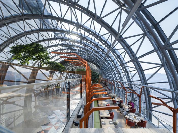这座被誉为世界最高横向摩天楼的“水晶连廊”,位于250米高空、长300米、室内面积超过10,000平方米,横跨四座塔楼,功能为重庆来福士的配套设施。2020年5月,水晶连廊的观景台部分正式向公众开放,在室外悬挑玻璃观景台上,观者可以饱览嘉陵江与长江交汇的胜景。重庆来福士水晶连廊还包括空中花园餐厅及酒吧、配有无边泳池的俱乐部,以及酒店大堂等。