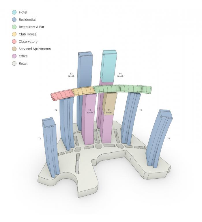 功能上,5栋塔楼是纯住宅,其中包括一栋350米的北侧塔楼,目前为中国最高的住宅建筑。另一栋350米的北侧塔楼为综合体——水晶连廊所在高度以下部分为办公楼,以上为酒店。其余两栋塔楼一栋是纯办公楼,另一栋是办公和高端服务式公寓混合用途的综合性塔楼。所有塔楼的北面均安装了“风帆”形状的屏风构件,与“朝天扬帆”的整体外立面达成统一造型的同时,也为在这里生活和工作的业主以及酒店客人提供了遮阳的功能。