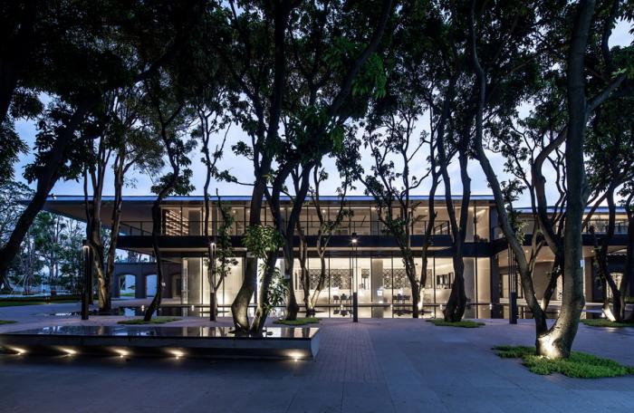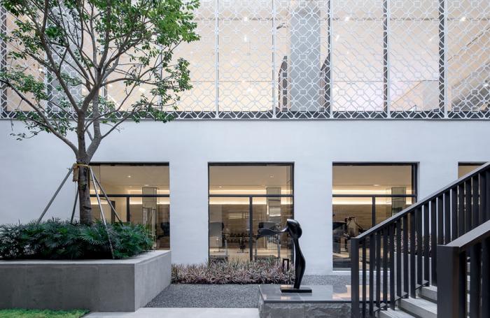 多场景多层次的入口空间,十一号楼前转盘得到了现代演绎,保留并重新梳理过的芒果林树阵与新建筑和谐共生,曲径通幽。时光荏苒,西园内古树仍沉默不语,兀自郁郁葱葱,同建筑一起留存一份传统中式园林的美感。缓步走在石板路上,仿佛仍能望见西园饭店烛光园、红番区和“大世界”的光景。