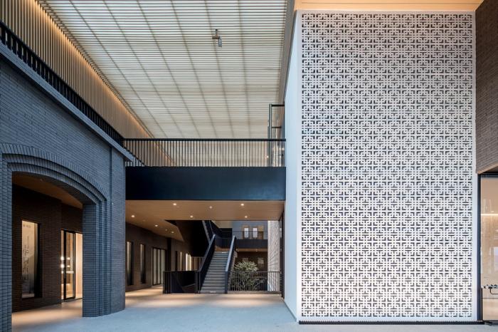 铝合金窗花与混凝土窗花对西园大门门头窗花的格栅元素进行提取及再现,铝合金窗花对竖挺、窗格外挂构件、水平龙骨等细节处做了精细化设计,将玻璃与外挂窗格单元结合;混凝土窗花从传统套方样式棂花元素简化、抽象出“西”字图案,别具匠心。窗格与青砖相映衬,交织出历史的厚重感。