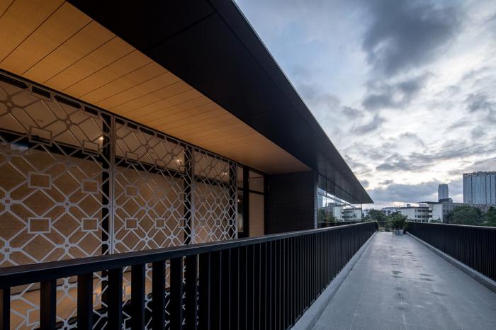 高大的中庭空间以窗花和木格栅作为点缀,泳池外连廊与茶室正立面外阳台以水磨石铺垫,灵活设计铁艺栏杆与双层夹胶玻璃分隔空间,与深色屋檐相呼应。