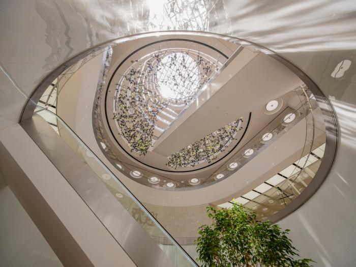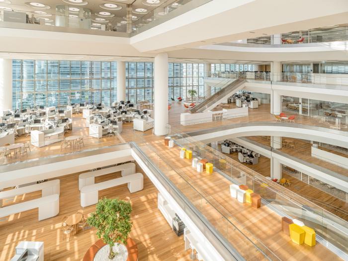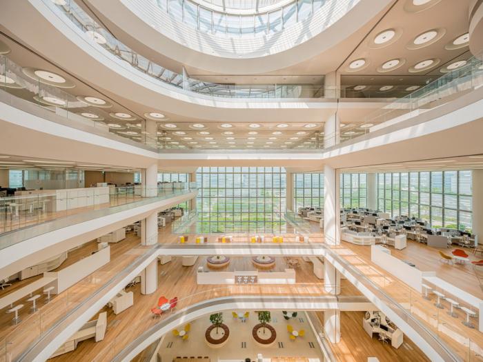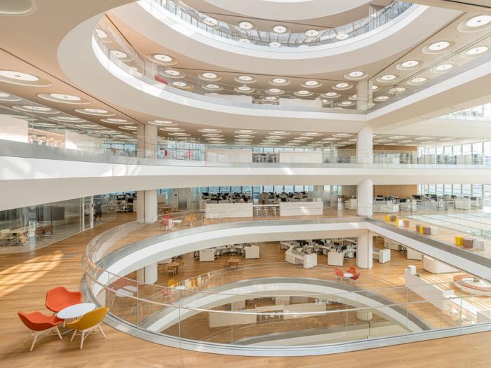 建筑师围绕中庭设计了螺旋的空间结构,以形成不同的层高。同时,这种错层的设计还可以促进员工间的视线交流和合作沟通,并使得自然光照可以更好地进入室内。
