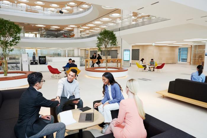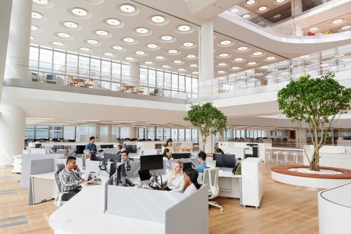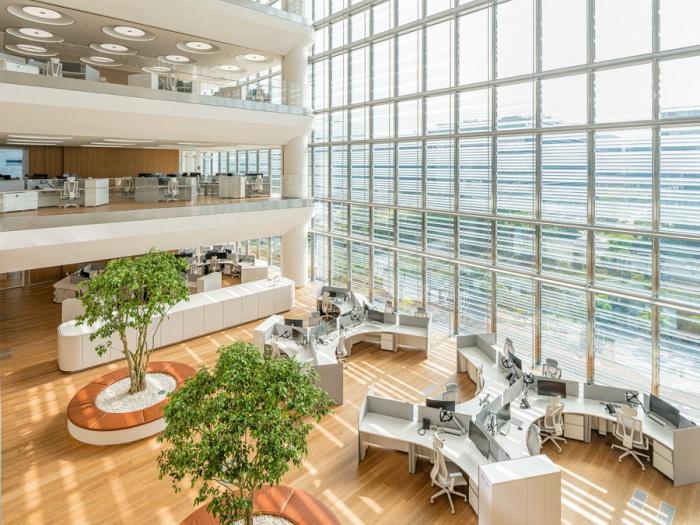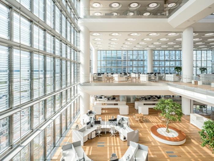 建筑师在材料面板的选择上,采用了温暖的配色方案,以搭配自然且灵活的工作空间。自然这一概念,在该大楼的设计过程中起到了极为重要的作用。建筑师还在各层布置了大量的室内树木,使得使用者的整个空间旅途都有绿意相伴。而中央的中庭空间,则是专门为非正式会面和中途休息所设计的。建筑师试图打造一个益于合作和沟通的办公空间,并使得其可以满足多种不同工作性质的需求,从而营造一个激发灵感的创意空间。