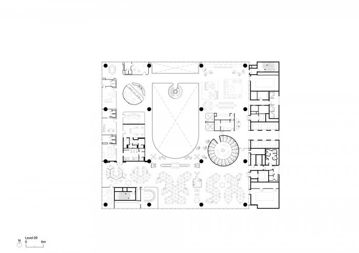 建筑师希望营造一个打破传统空间等级的室内环境,并同时将这种平等传递到公司的内部结构中。例如,公司的高层就和各自的团队在同一层的空间进行办公。而顶层的行政商务休息室则旨在为公司负责人们提供一个非正式会面的空间,以促进灵感的碰撞与交流。同时,建筑师还在大楼内设置了健康关怀相关的基础设施、员工餐厅、健身房、景观露台和屋顶休息区。而屋顶花园的视野则可以俯瞰整个板桥地区,并为各类公司活动提供专属空间。