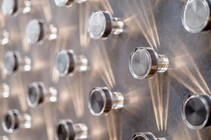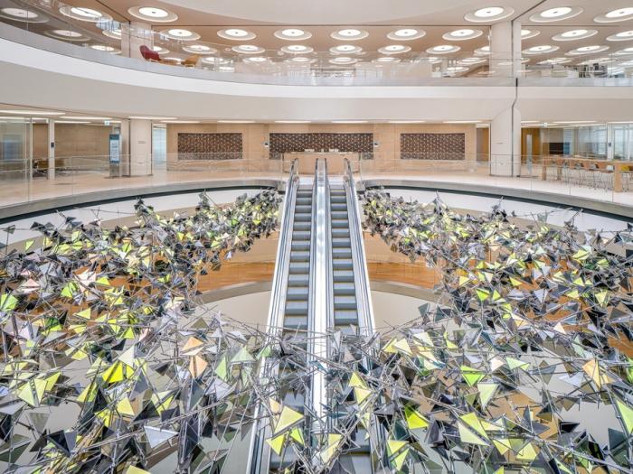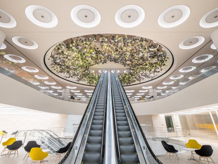 建筑师在中庭设置了一个由Jason Bruges工作室设计的,名为“数字叶序”的大尺度艺术装置。当来访者进入空间内部顺着扶梯上行时,就可以感受到沉浸式的艺术作品。这个装置试图寓意树冠,从而给室内带来一丝自然之感。而当来访者通过这个艺术装置到达旋转的中庭空间时,其可以瞬间感受到强烈的灯光、阴影和色彩变化。接待空间同样也设置了一个三联画艺术装置,名为“动态胎面”。