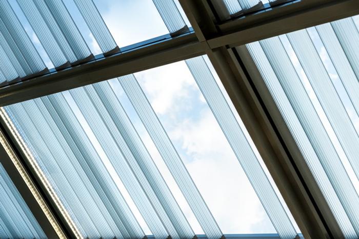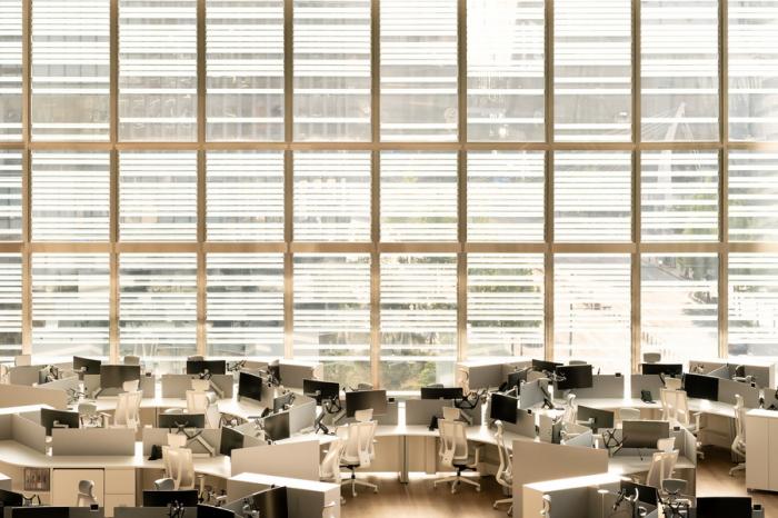 建筑师在大楼的立面设计上,进行了细致地考量,使得进入空间的自然光得以最大化。建筑师还根据不同的室内照明需求,采用了不同密度的立面玻璃百叶窗。例如,建筑师给社交空间提供了最大的自然照明,并使其空间节奏尽可能地变得舒适。但在工作区域的照明设计上,建筑师就采用了智能的人工照明系统,以精准控制其照度。这样一来,大楼的立面设计在满足内部空间照明需求的同时,还形成了一个特殊的视觉效果。