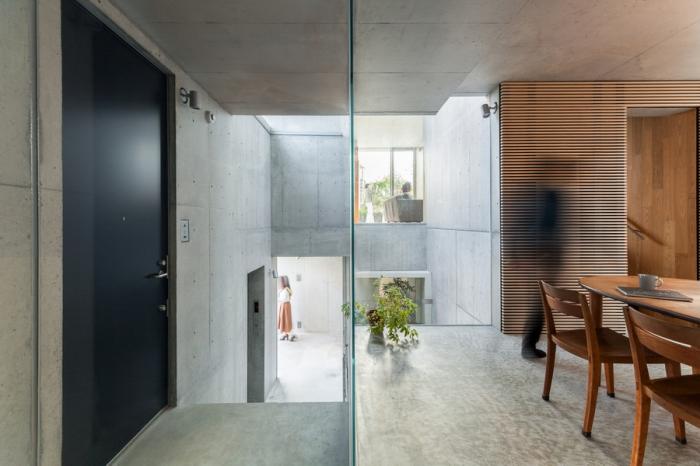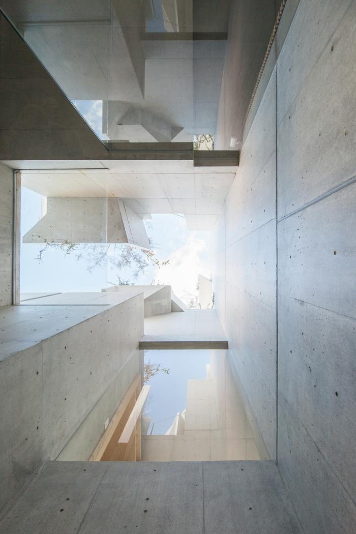 混凝土盒子是三维对方的,主结构有着复杂的间隙。打开朝向植物的窗户,将室内和室外联动起来,同时创造适合人身体感受的空间。另外,我们把褶皱处布满植物,创造一个有机的整体,在周围的环境中像树一样呼吸。