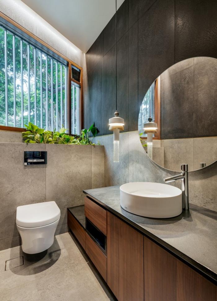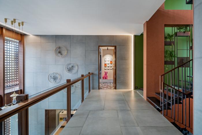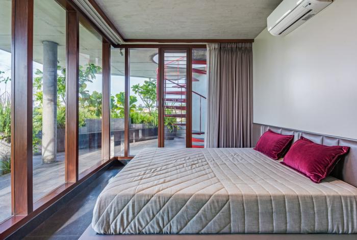 概念也与二楼布局产生了共鸣。两侧的机翼设有单独的床和浴室,最终汇聚在核心的人行天桥上。位于三楼的露台开放,形成了一个风景优美的有利位置,朝向城市茂密的植被。它在核心位置设有一个封闭的露台休息室,周围环绕着开放式露台。客床和浴室坐在露台布局的东翼。
