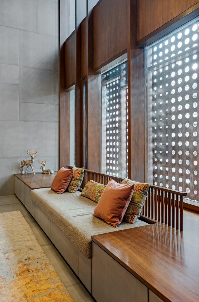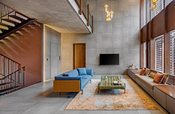 防御性的堡垒式外观突然转变为温暖而保护性的内饰。这些空间展现出质朴和平实的色调,并与中性的墙壁和地板色调相呼应,与建筑风格相呼应。这为泥土色调和室内景观提供了充足的空间,从美学上使空间更加生动。斑驳的光线通过耐候表皮渗入,为场景增添了画龙点睛的效果。以“新光”渲染室内,创建了独特的照明效果。