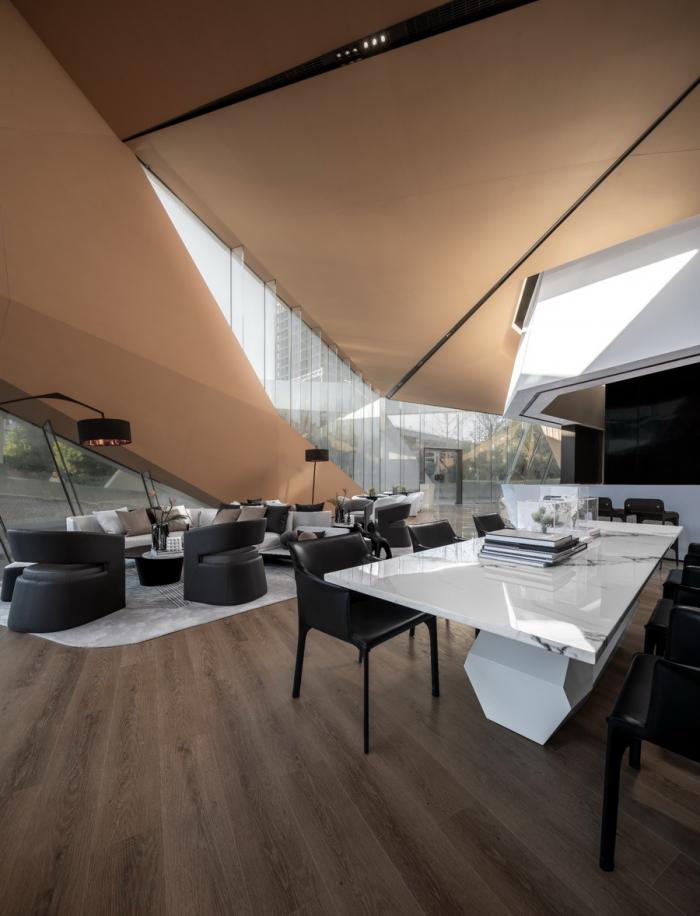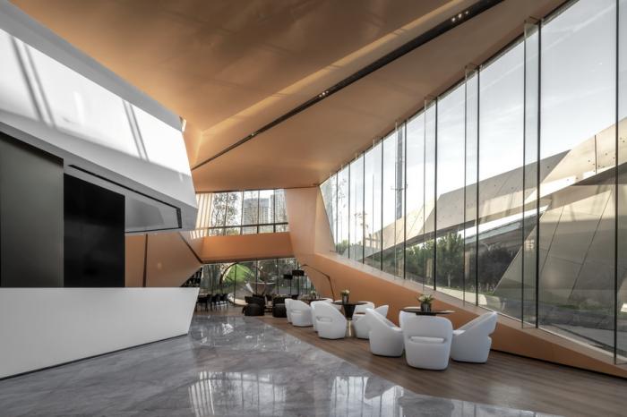 室内设计采用跟室外一体化的元素:通过折面吊顶延续建筑外立面的雕塑感,颜色上采用香槟色,相比外立面的铝板在感受上更加温暖近人。