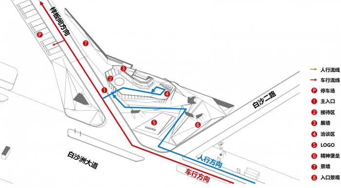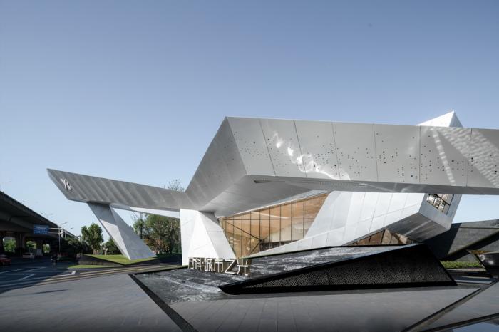业主希望在展示中心基地入口处创造一个视觉制高点的精神堡垒,吸引远处和高架方向的人流目光。因此我们通过连廊线性空间将建筑与雕塑联系起来,在统一的建筑语言与水平的建筑形体中,自然生长出垂直的精神堡垒。建筑整体浑然天成。