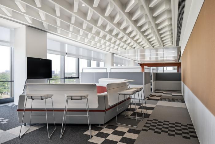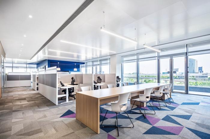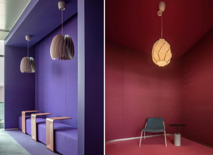 工位组团间,以开敞协作桌作为间隔,用地铺和天花造型作为软式隔断对其进行划分,强调空间属性。