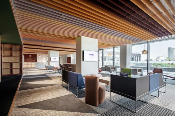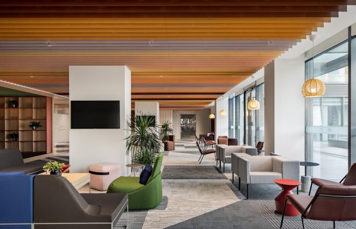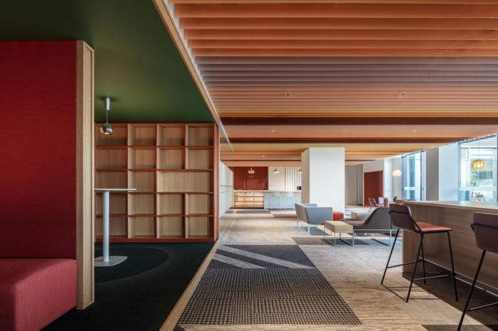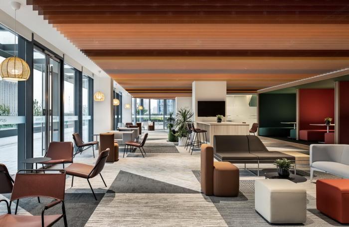 这里不仅是全楼最大的休闲区域,还规划了健身房、瑜伽室、游戏室等活动空间,旨在通过增加公共空间来创造凝聚和互动场景,达成聚合状态,增强办公空间中的社交属性。