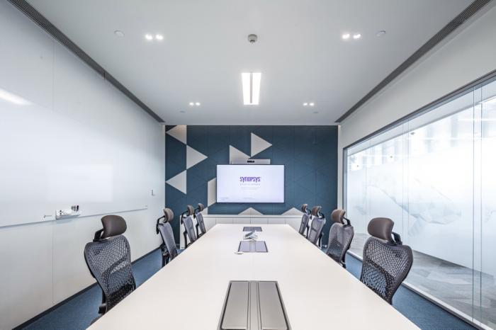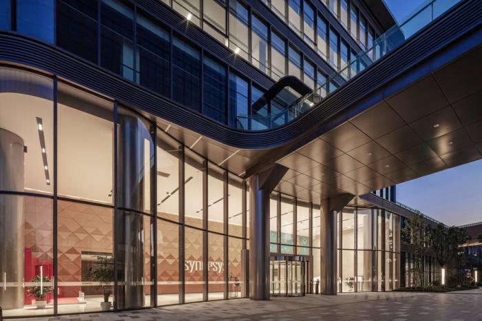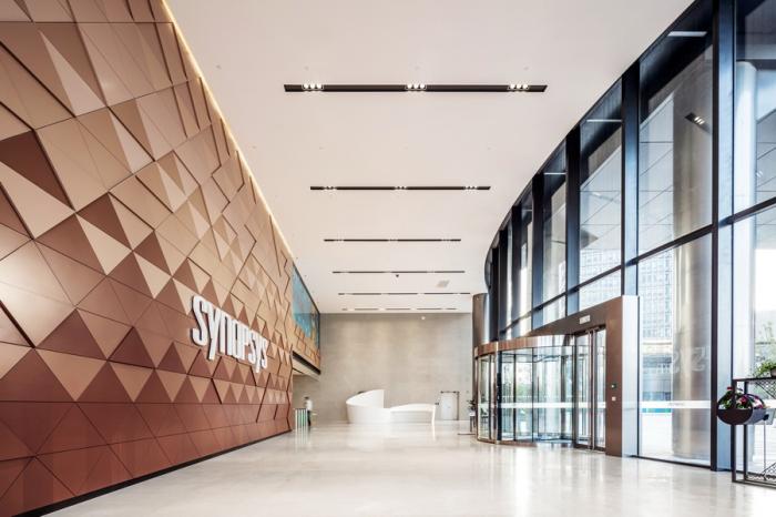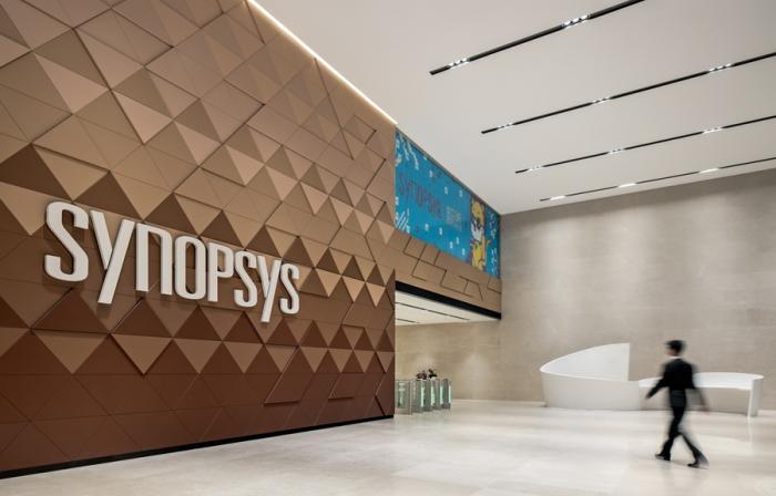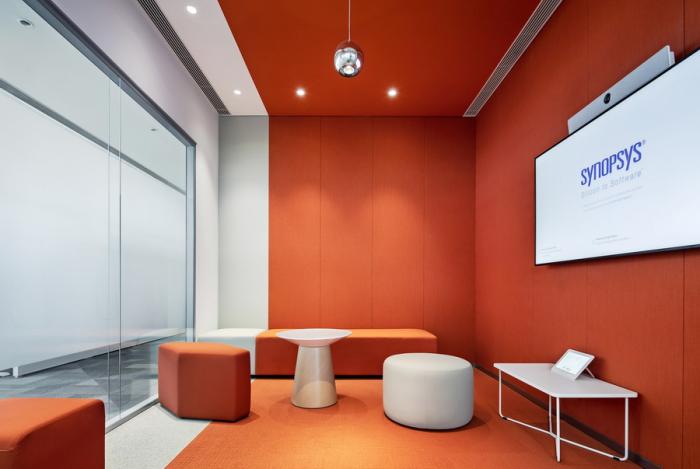 值得一提的是大堂接待台的设计,它既是新思科技(SYNOPSYS)英文首字母“S”的形状提炼,也以流畅圆润的曲线体现了新思科技开放包容的企业文化。