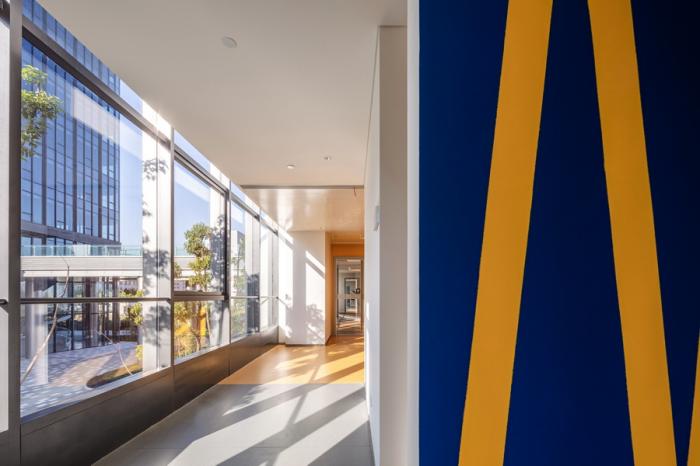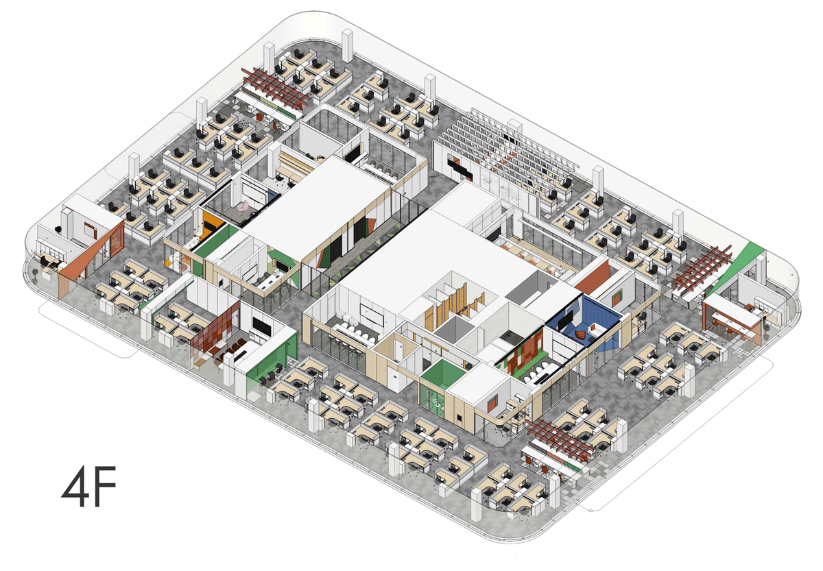 其中,二、四、六层以“橙、绿”色为主题色系,“方形”为基础元素,用芯片中看似不规则的图案拼接方式对空间内不同区域进行创意性演绎,增加建筑趣味性与空间张力。