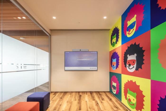 作为企业集中休闲娱乐的空间,区别于办公区的克制,芯片所属的灵活、变化在这里被运用到极致,浓烈的色彩与拼接图案的碰撞,不断激发创意和工作热情,呈现出一个更为灵活、舒适、自由的活动环境。