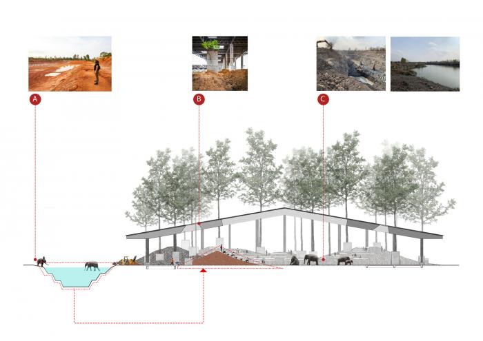 项目基地距离河流大约有4公里的距离,但考虑到200只大象们的巨大耗水量,建筑师还设计了一个雨水收集池,以应对这一挑战。而收集池的建设,也刚好使得8500立方米的土壤可以用于土墩的建造,从而形成一个类似于圆形剧场的庭院空间。