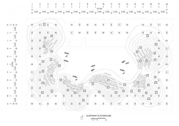 建筑师通过六个土墩的设置,将庭院的三侧进行了围合,并将第四侧留空,以给大象和来访者提供合适的入口空间。建筑师将起伏坡度控制在1.2米到4米之间,来呼应起伏的自然地形。同时,这种特定自然场景的模拟,还使得大象可以到处闲逛,从而免于蚊虫的叮咬,并降低自身体温。
