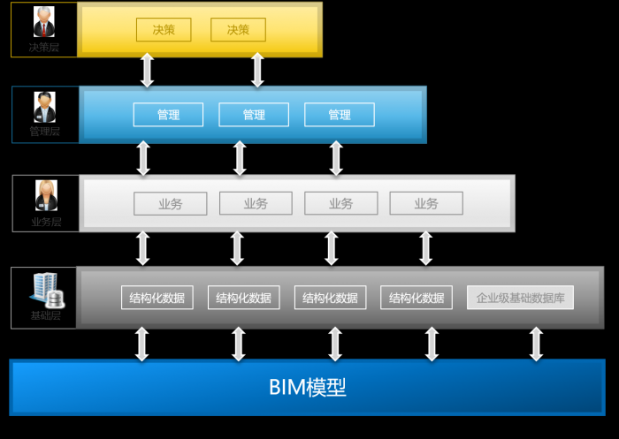 再往上一层,管理层将业务层的成果进一步管理,例如造价成本、进度计划、采购规划等,通过审核流程、功能流程,真正把业务流程贯通起来。