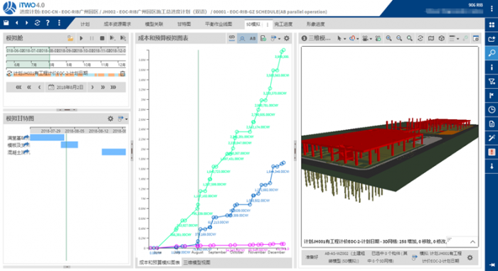 在iTWO 4.0中将进度计划信息与成本信息管理关联并一一对应,方便制定资金计划、采购计划或者资源需求计划,也可以把进度、成本、模型三者关联,对整个项目进行5D模拟,快速了解项目成本的累积过程,提前预测整个施工流程的潜在风险等。