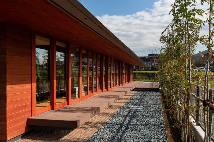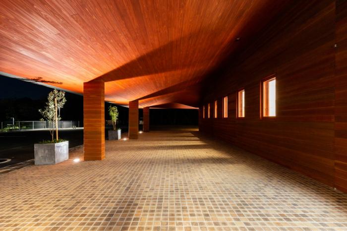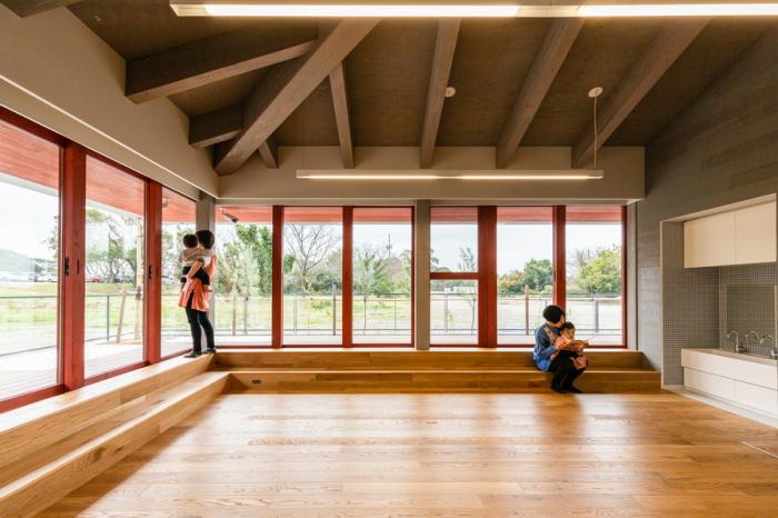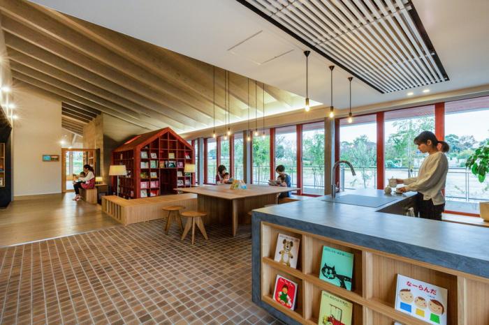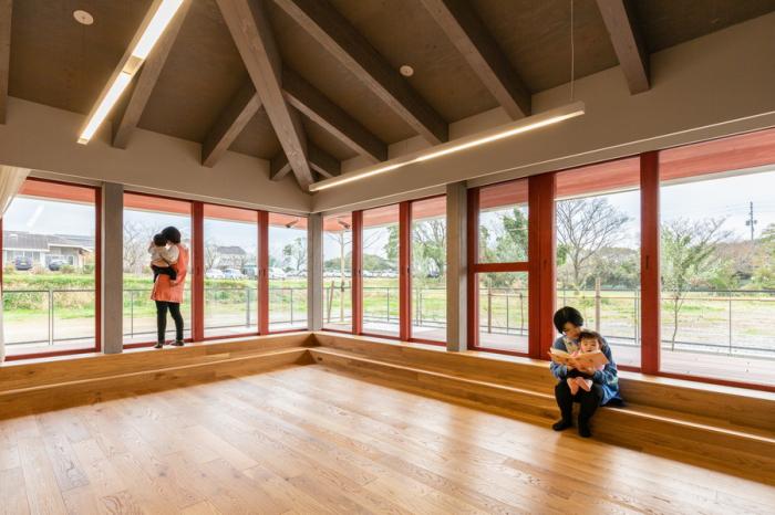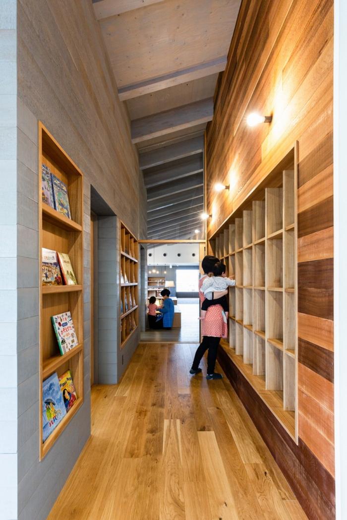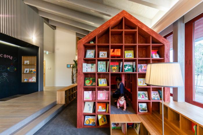 这是一个在日本长崎的日托所项目。一个最近令人担忧的问题是,过多的看屏幕的时间会对孩子的语言能力产生负面影响。另一方面,大声朗读以及儿童与成年人之间的互动交流,可以使他们的行为问题和给父母的压力减轻。在这样的背景下,我们的想法是利用“屋檐下的图书森林”,自然地赋予孩子阅读和朗读的能力,并培养他们丰富的思维方式。