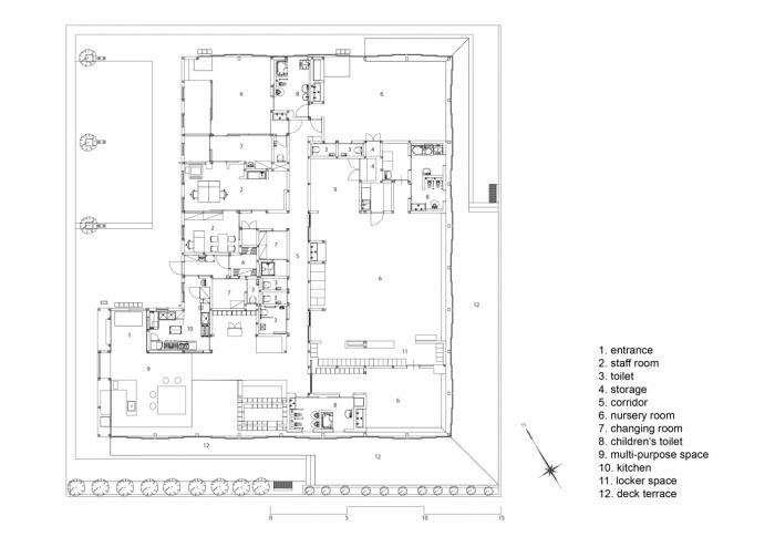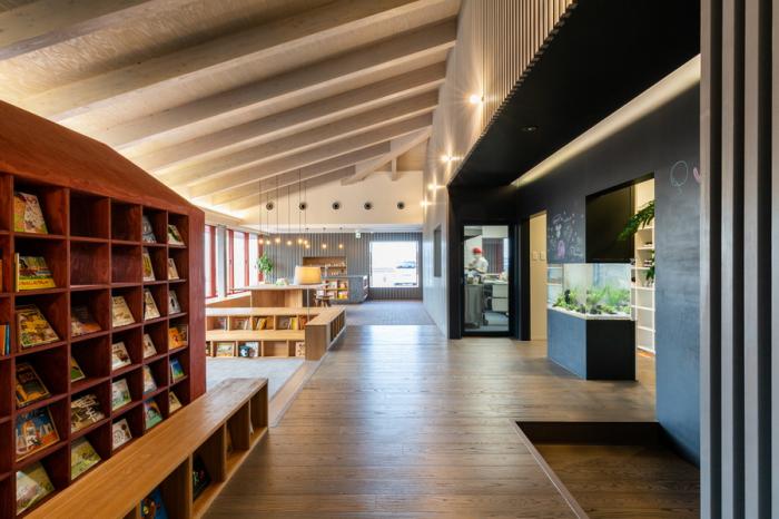 几个书角散布在整个日托所里,以营造一个在整体的木制屋顶下的“书林”的氛围。厨房旁边的书柜里的书是关于“食物和食物教育”。有一个里面装满图书的小屋,而在鱼缸旁边是一个“生物书架”,里面是与各种生物有关的书籍。