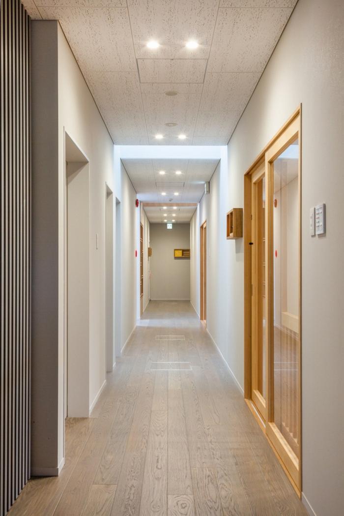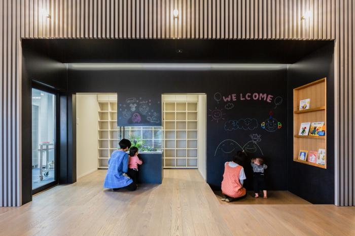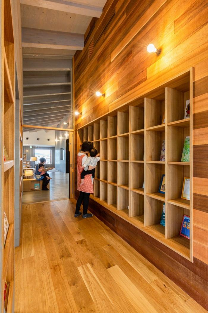 天窗下方的书架是与天空和天气有关“地球书架”。 来托儿所的父母也可以使用的入口附近的图书架里是与儿童和父母有关的书籍,为生病后的孩子准备的是“恢复元气书架”,以及还有老师推荐书籍的课堂主题书架。即使只是翻阅日托所不同角落的这些不同书籍,孩子们也能学到很多东西。
