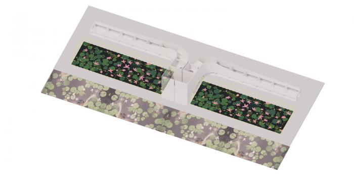 周边纺织废弃仓库被拆除之后,两座老粮仓并排于这片土地。其北向运河,南向大片腹地,且濒向池塘。仓与土地的关系,呈东西走向。因此,外部新增建筑体量的最优解,是呈一种“伴随”姿态,与老粮仓发生新的“剧情”。