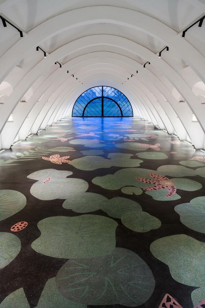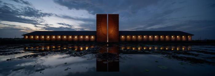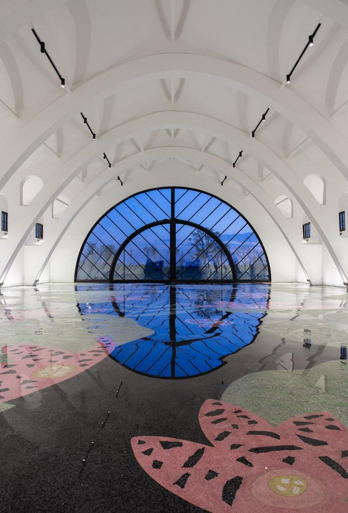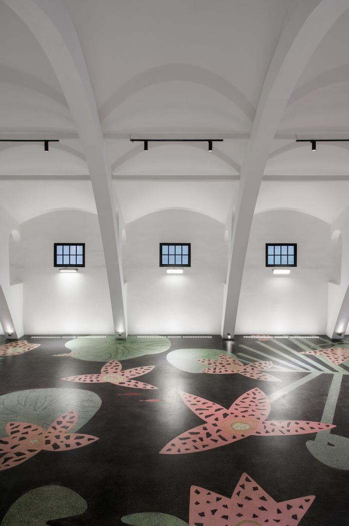 嘉兴王江泾镇,陶仓运河与百亩莲花荡片区附近,两座老粮仓。其建造于50-60年代,前身是当地居民储放稻谷的粮食仓库,后经历火烧,废弃空置数年。仓前一片优雅的莲花池,推测是过去用于建筑就近取水防火之用。陶仓与莲花池互相映衬,“莲仓”别名,因此而来。改造后,仓里的水磨石莲花纹样与粮仓的结构拱圈秩序,呼应而来。