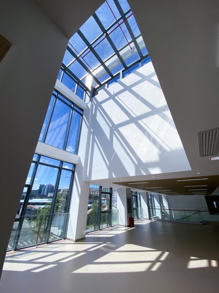 IV、由内而外的建筑形式,将室内公共空间外化,按功能设置标准化的建筑模块,留出公共空间,采用自然采光通风。建筑外立面通过开窗形式呈现出建筑的韵律感,大面积玻璃窗的设计结合内部各层公共空间,明亮通透,营造富有活力的公共空间。建筑的内部则是以一种柔和的姿态呈现出来。自然而不刻意,带着建筑的标识性。