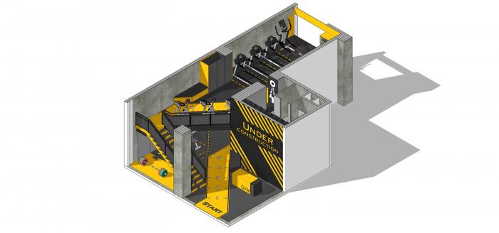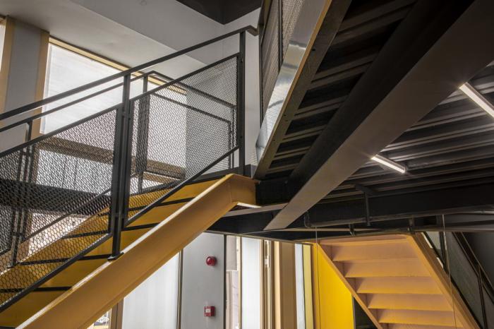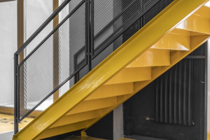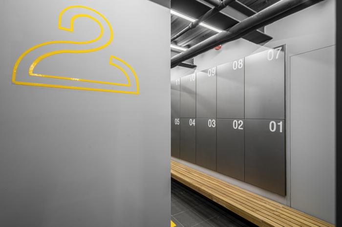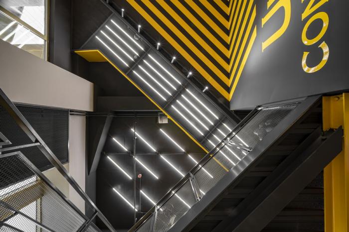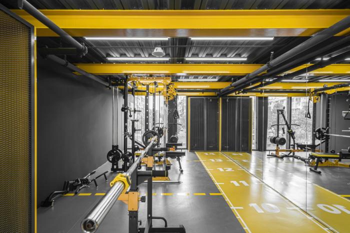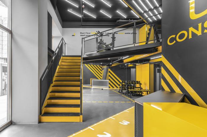 UNDER CONSTRUCTION健身房需要延续其“未完工的施工现场”这一设计风格,不同于以往裸露混凝土、工字钢等结构部件的设计手法,大观建筑在此次健身房的设计中以夸张的“黄色警戒线”来体现施工现场的视觉效果。