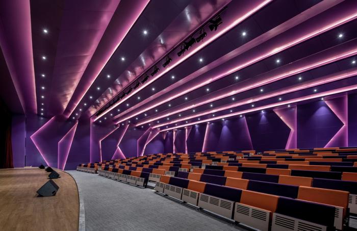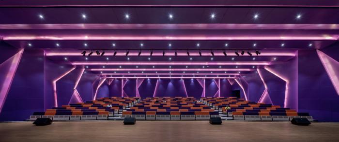 教学目标由原本的学科知识传授转变为培养解决问题的能力,我们将校园西侧三个点状体量的内容从按学科分置的各类“用房”,整合成为跨学科的“校园之心”、“科技中心”与“艺术中心”相呼应。正中的“校园之心”剧场,以紫水晶为形式母体,通过对原本完整的室内界面的切削和舞台、座椅的独特布局方式,从尺度、观感、物理环境等维度优化了使用体验。由布局灵活、设备先进的开放式工作坊与兼顾研讨的实验工作室组成的科技中心使“项目式学习”成为可能,孩子们的认知边界不再局限于一门学科、几本书籍与一间教室,沟通与探索成为了解世界的重要手段。标准化的音乐教室也被唱游教室、大小琴房、舞蹈、器乐排练厅、编曲工作室、黑箱剧场等丰富的差异化功能所取代,令孩子们多种多样的才艺可得到积极的培养与关照。