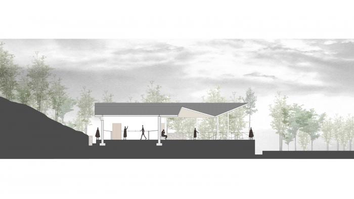 整个场地靠着一座山和一片树林,建筑就着与“山”、“树林”的关系,形态因此产生,平面上的折线和立面上的折线放到一起,形成了“横看成岭侧成峰”的姿态。