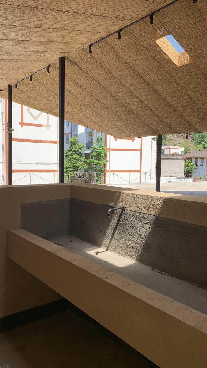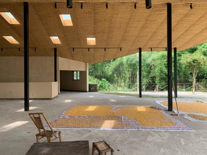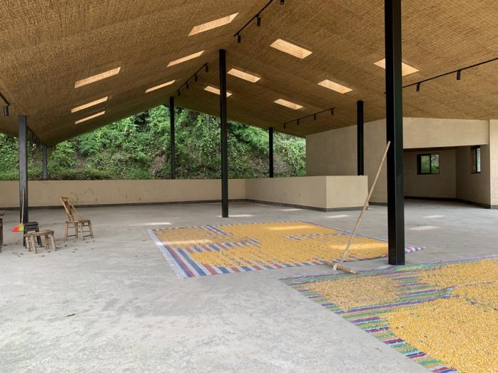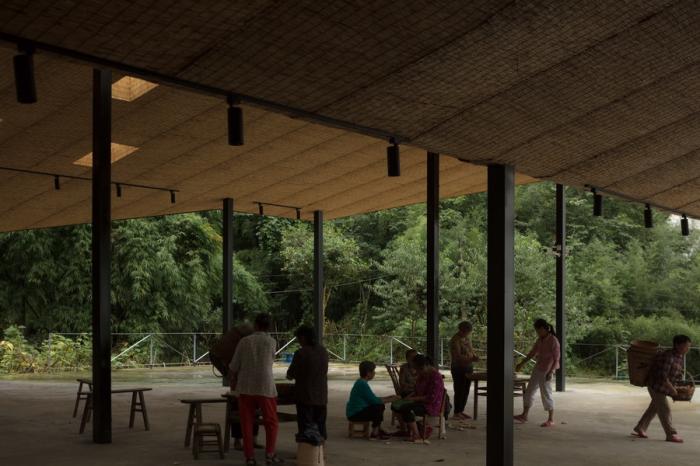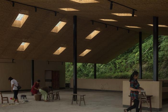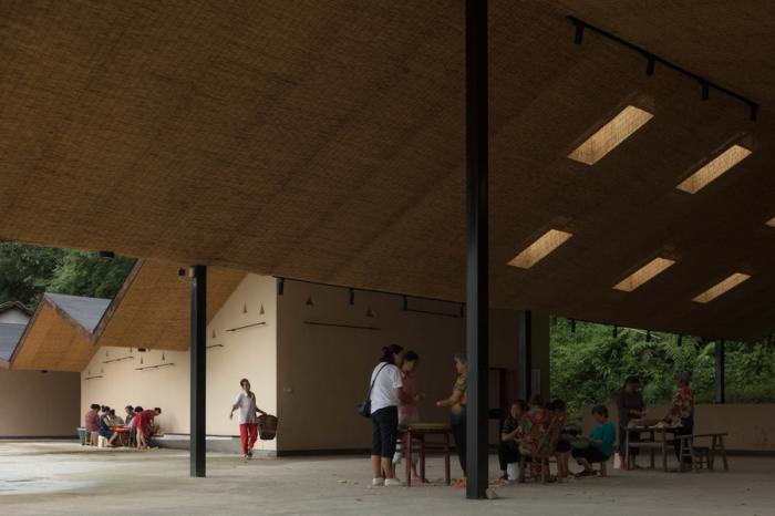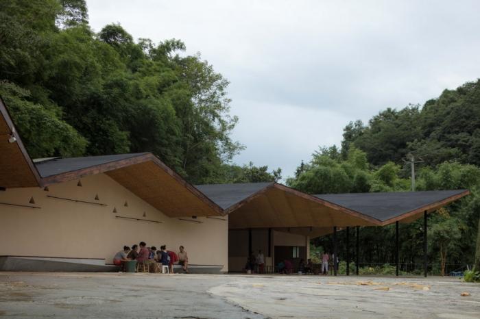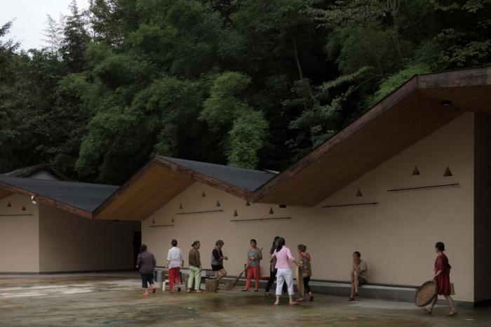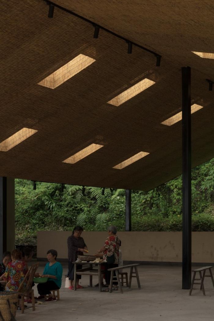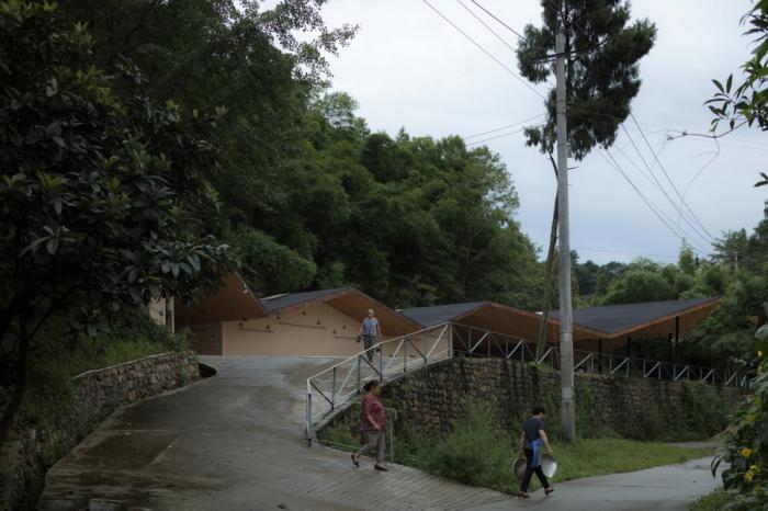 一切设计源于最本质的需求,五统一的选址,遵循着粮食晾晒和洗衣晾晒的基本需求,阳光的方向。为了最大限度的空出晾晒和坝坝宴的场地,建筑紧靠山体,繁茂的植被影响到室内的采光,不需要刻意的手法,自然顺应折线的方向开窗,让室内被自然照亮。站在室内,抬头看见树林,低头看见阳光,营造出在建筑上跑着山脊和阳光的景观。