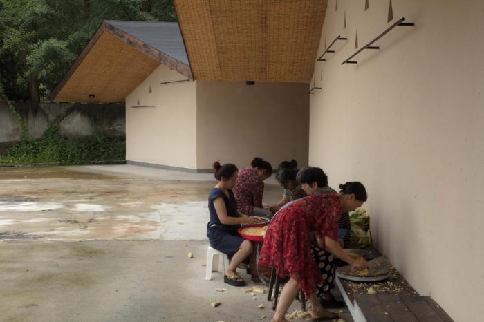 五统一作为整村更新的实践项目之一,和文化大院是一个互补的空间,如若说文化大院呈现出场景是“村民檐下喝茶”、“健身”、“学习”等,那五统一则是整合了村子琐碎的生产、生活的空间。在这里进行“谷物晾晒”、“坝坝宴”等,让已形成经验的生产劳作、日常生活、传统工艺、民间习俗、民间仪式等。