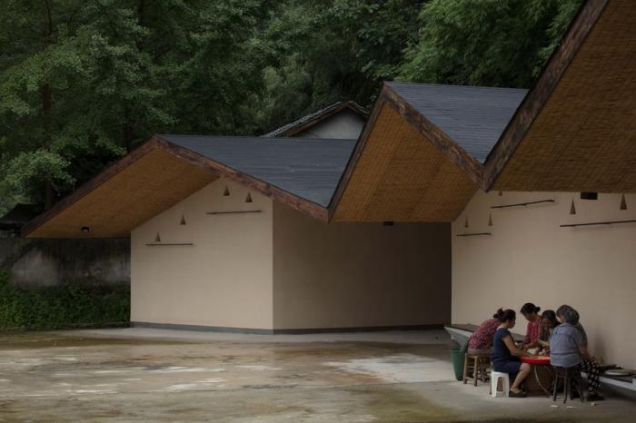 我们将建筑布局在“单元楼”式的芭蕉苑小区南侧,为此小区做公共空间配套。建筑靠青山,面向小区,呈开放拥抱式形态,利用这种空间导向,将邻里空间放大、拉长。希望下楼的村民可直接看到五统一里发生的场景,促进交流,为各种文化事情的产生埋下了一颗种子。