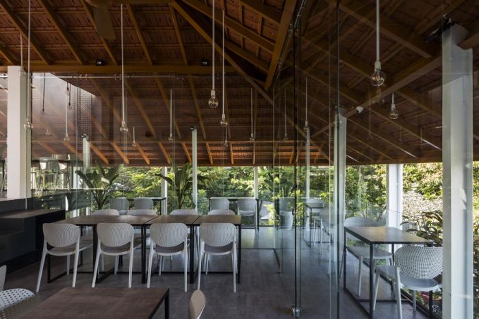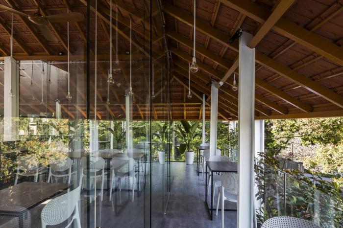 通过室内体块和外部空间之间存在的虚实比例,创造出建筑周围两个主要立面周围的大空隙和空隙。设置在墙上不同位置的玻璃滑门帮助建筑实现通风。通过横向扩展和纵向收缩,周围的自然景观更贴近用户,使得建筑物内外形成视觉联系。因此,这种设计不仅增强了与周围环境的凝聚力、促进两者友好共处,还形成了商业和服务建筑的重要吸引力。