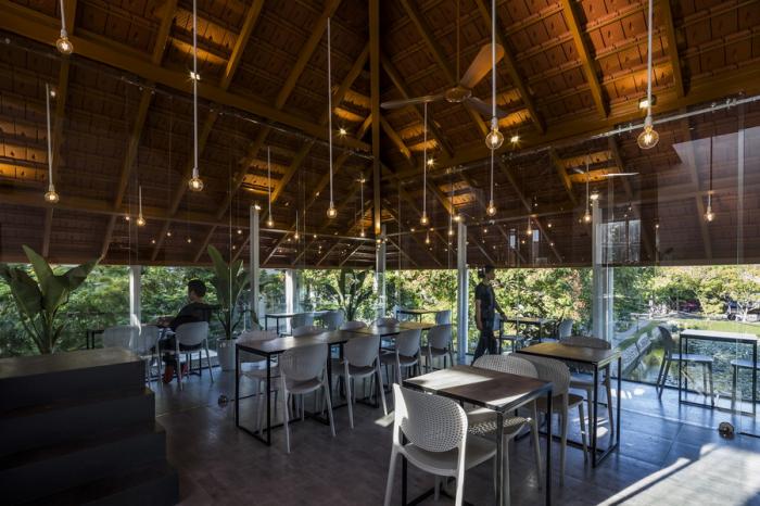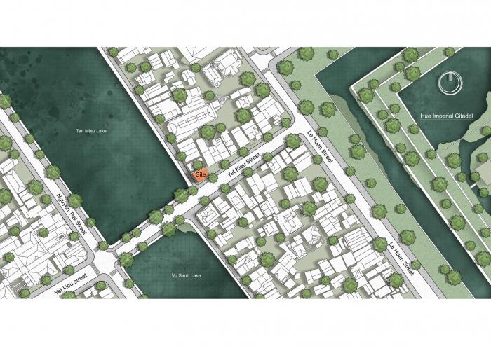 O2咖啡店坐落于越南顺化市,占地120平方米,连接起位于它两侧的道路和湖泊。场地位于一个具有特殊文化和历史特色的居住区,紧邻着顺化皇城 "Dai Noi"。“Dai Noi“是越南旧封建王朝时期(19 – 20世纪)的要塞的通称,它们被用来保护重要的宫殿,并已被联合国教科文组织认定为越南的世界文化遗产。
